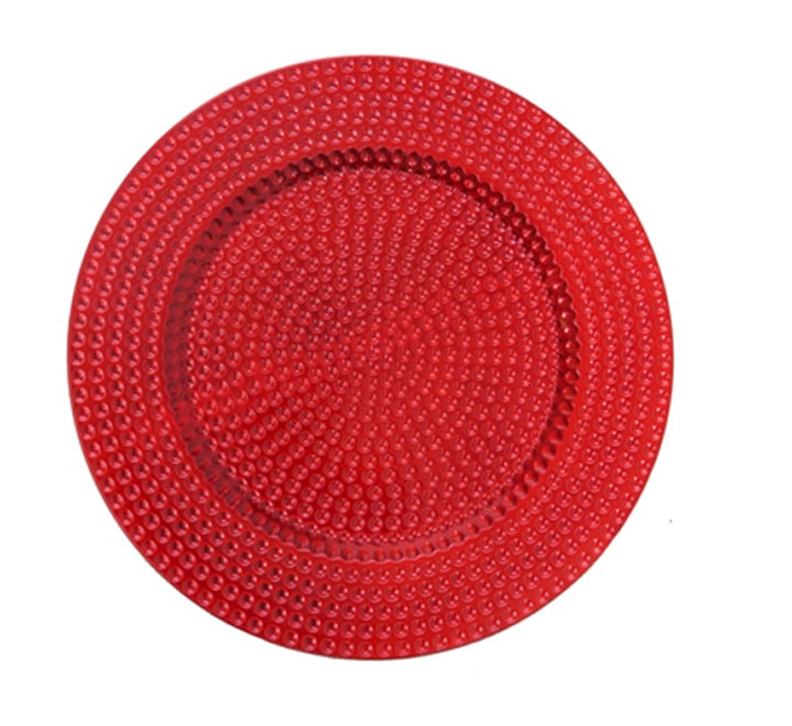 The Dotted Plastic Underplate in red is a vibrant and eye-catching piece that adds a festive and playful touch to your table setting. Featuring a textured dotted pattern, this underplate is perfect for holiday meals, themed parties, or bold decorative tablescapes. Durable and easy to clean, it's a fun yet functional choice for any occasion.