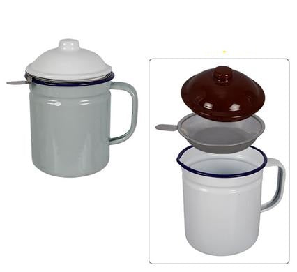 The Oil Pot with Strainer 14cm - Enamel is perfect for storing and filtering cooking oils. Its durable enamel coating ensures longevity, while the built-in strainer allows for easy removal of food particles, keeping your oil clean.